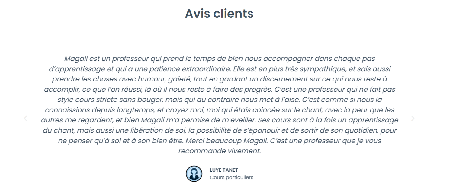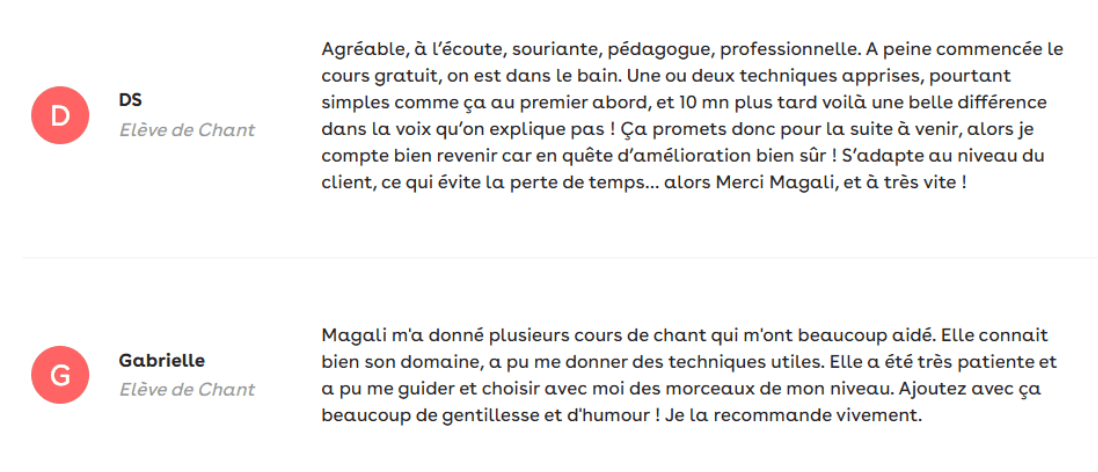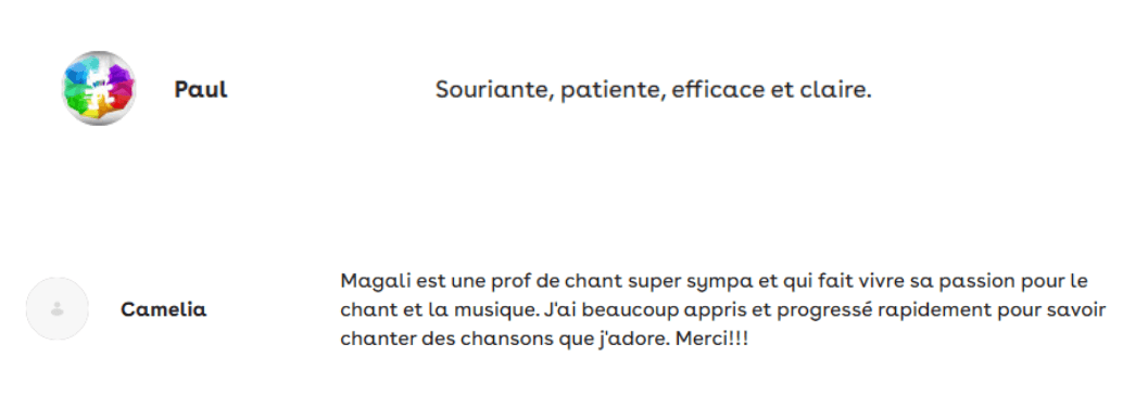 Oui, tu peux me poser des questions. Tu trouveras aussi deux types de services en sus. Un pour m'envoyer ta vidéo et recevoir des conseils personnalisés pour travailler ta chanson ou ton expression. Avec l'autre tu pourras réserver une session privée en visio avec moi avec un accès prioritaire. Attention, ces services ne sont pas inclus dans l'offre.