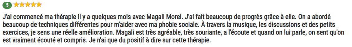 Magali m'a accompagné pendant une grosse période de stress. Mon anxiété m'épuisait. Toujours à vouloir avancer et trouver des solutions à chaque nouvelle situation. J'ai appris à gérer les choses différemment et je me sens mieux pour faire face encore aujourd'hui puisque mes sources de stress ne se sont pas toutes arrêtées pour autant. N'hésitez pas à vous approcher de Magali.