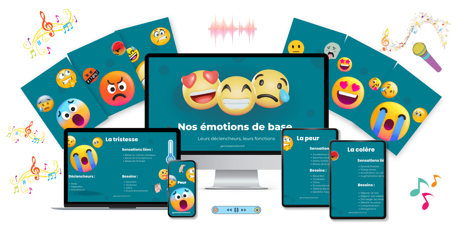 Un jeu de cartes complet qui te permet d'aborder les émotions de base sous différents angles, de manière ludique et avec différentes nuances. Comment ? En écoutant une chanson et te posant une question pour guider ta réflexion.
